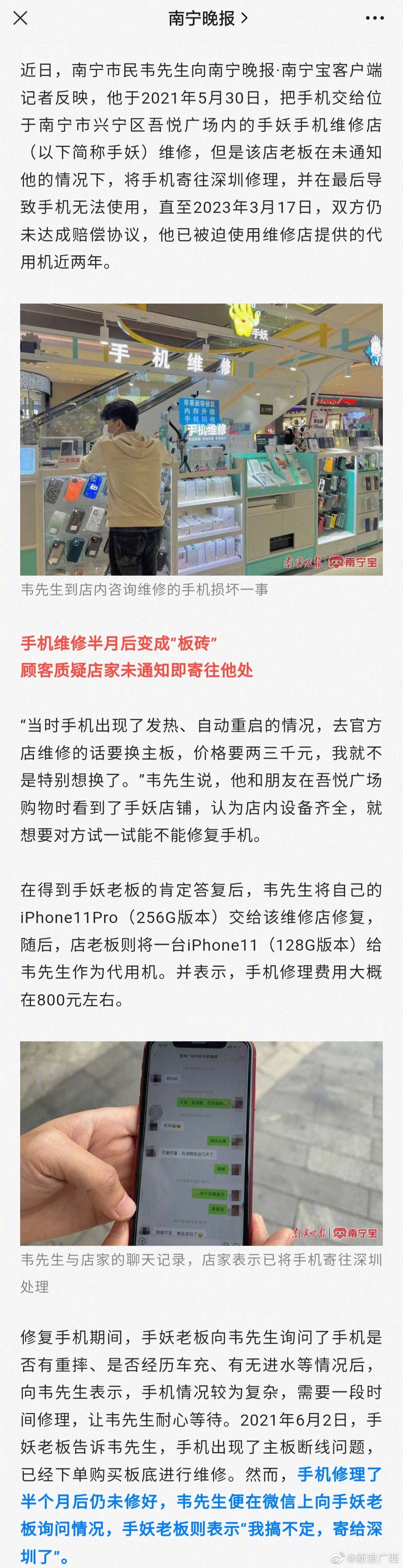 】近日,南宁市民韦先生反映,他于2021年5月30日将手机(iPhone11 Pro 256G版本)送去手妖手机维修店进行维修,随后维修店老板在未告知他的情况下擅自将手机寄往深圳修理,最后导致原本只是不时自动重启的手机变成了无法使用的 “板砖机”,韦先生表示难以接受。直至2023年3月17日,双方仍未达成赔偿协议,两年期间他一直被迫使用维修店提供的手机(iPhone11 128G版本)。而维修店老板表示,如果韦先生需要继续使用代用机,希望韦先生能补偿店方1000元,但韦先生表示不同意该提案。对此,你怎么看呢?