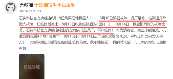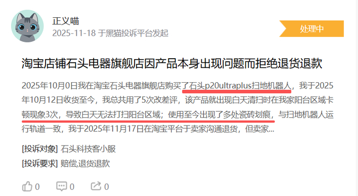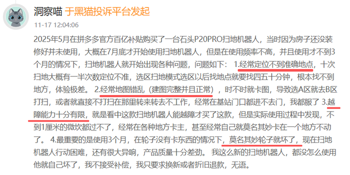 比如,11月17日,有用户投诉称,其购买的“石头P20 Pro”在使用不到三个月的情况下,出现多项故障,包括定位不准、地图错乱、越障能力差以及轮子异常损坏等问题;11月16日,有用户投诉“石头P20 Ultra”存在漏水及机器人模组异常,导致无法正常使用;一名消费者于10月16日反映,在石头科技官方旗舰店6月18日购买扫地机器人,8月10日、10月14日两次因机器故障,返厂维修……