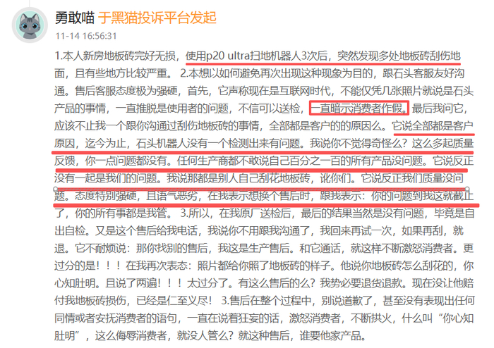 11月17日,有消费者反映,其于今年10月3日购买、11月7日安装的“石头P20 Ultra Plus”,在使用数天后导致家中地砖出现多处明显深度刮痕。在与石头科技客服沟通要求退货退款未果后,该消费者要求公司派专人上门拆卸、打包并办理退货退款。11月14日,有消费者指出,新房地板在使用“P20 Ultra”三次后出现多处刮伤,部分区域损伤较为严重;同日,另有用户表示,在2025年10月16日购入“P20 Ultra Plus”,首次使用即发现其对地板造成划痕。