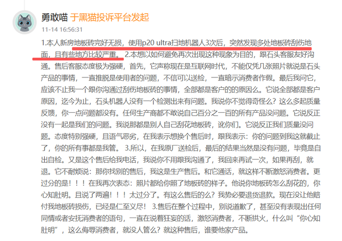 11月8日,一位消费者在黑猫投诉平台反映,自己于2025年10月12日收到的石头p20 ultra plus扫地机器人,使用至今出现了多处瓷砖划痕,与扫地机器人运行轨道一致。