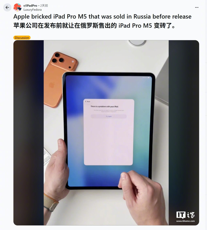 【彻底变砖,苹果远程锁机俄罗斯博主提前偷跑的 M5 版 iPad Pro】11 月 21 日消息,俄罗斯博主 Wylsacom 曾在今年 10 月 1 日偷跑 M5 版 iPad Pro 平板,并在 YouTube 平台高调发布开箱、跑分视频,距离苹果正式发布提前半月有余。据科技媒体 Wccftech 昨天报道,苹果现在已经对这台 iPad Pro 进行远程锁机,让这台平板卡在激活屏幕,无法再正常工作,除了充电以外基本上无法进行任何操作,因此这台设备现在几乎等同于一块昂贵的砧板。#苹果锁机事件##iPadPro泄露#