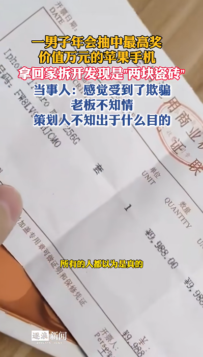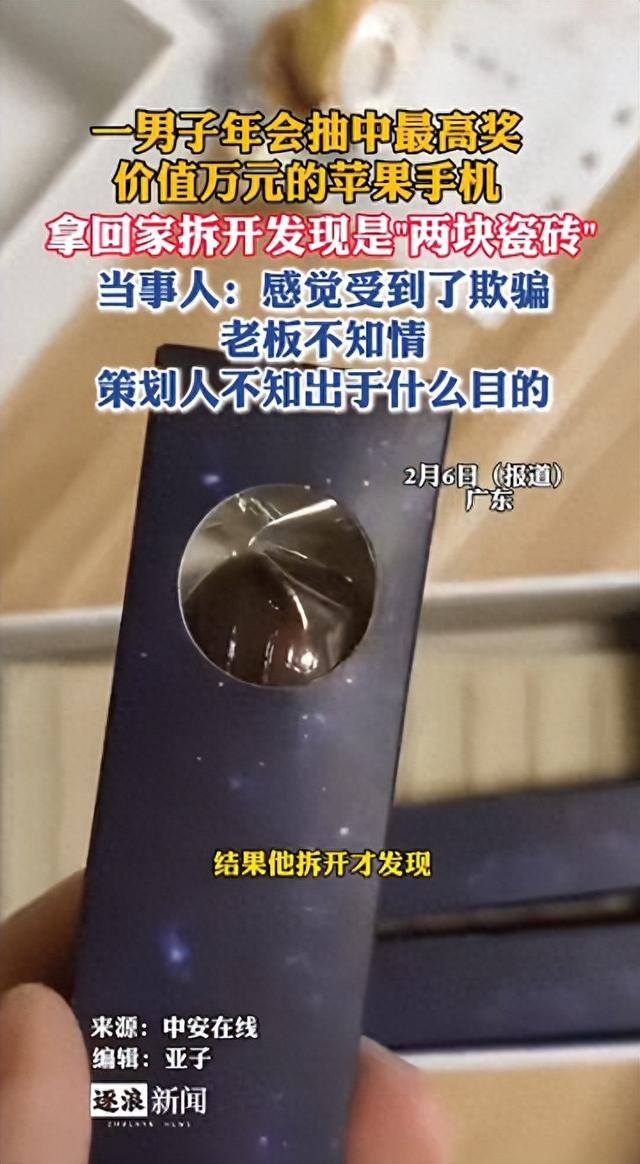 2月6日,据中安在线报道,广东一男子年会抽中最高奖一台价值万元的苹果手机,当场没拆开想拿回家给妻子拆,没想到手机竟然变“两块瓷砖”。当事人表示:“这是年会!很气愤,感觉受到了欺骗,老板不知情,策划人不知出于什么目的。”